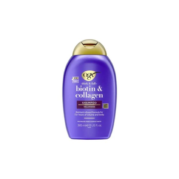 شامپو ضخیم کننده بیوتین و کلاژن OGX با کمک ویتامینها و پروتئینها رشتههای مو را استحکام بخشیده، حجم داده و ضخیم میکند. این محصول فاقد سولفات بوده و بافت بسیار سبک ی داشته که حس سنگینی و چربی به مو نمیدهد. این محصول حاوی بیوتین یا ویتامین B7 بوده که ترکیب آن با کلاژن به تغذیه و سلامت موها کمک میکند.