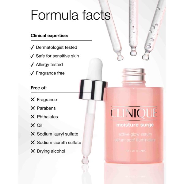 سرم Moisture Surge Active Glow کلینیک به طور موثری پوست را آبرسانی و رطوبترسانی کرده و به روشن و شفاف شدن رنگ پوست کمک میکند. همچنین این محصول برای انواع پوست مناسب بوده از پوستهای بسیار خشک تا چرب میتوانند از آن استفاده کنند.