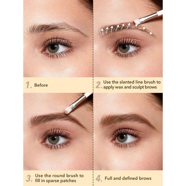 ابتدا روشن ترین رنگ یعنی وکس ابرو را با استفاده از براش زاویه دار به ابروهایتان بزنید. سپس رنگ وسط را با کمک براش گرد به نواحی خالی ابرو بزنید تا ابروهایتان پر و یکدست شوند. در آخر از رنگ تیرهتر برای کانتور و فرم دهی نهایی ابروها استفاده کنید.
